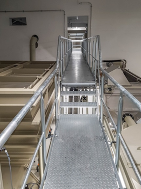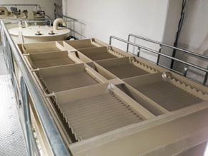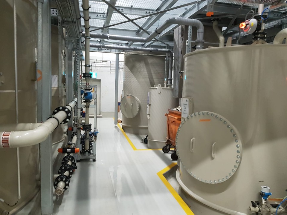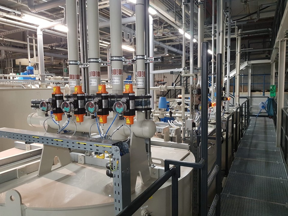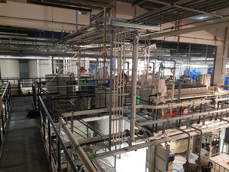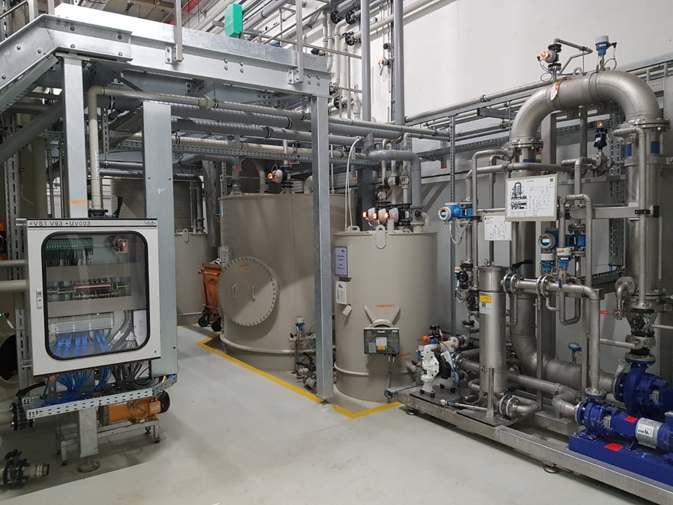- Behandlungsstufen: Abwasserspeicher (10 m³), Fällung/Flockung mit speziellen, nicht aufsalzenden Flockungschemikalien, Lamellenklärer, pH-Einstellung, 2-stufige Schlußfiltration bis 0,2 µm, Klarwasserspeicher (10 m³) mit Druckerhöhungsanlage zur Versorgung der Produktion, Schlammentwässerung über Bandfilter