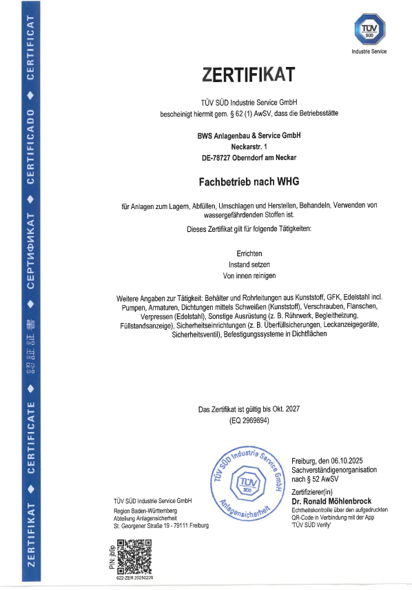 WHG-Fachbetrieb? Selbstverständlich. DIN ISO 9001-zertifiziert? Natürlich. Managementsystem für Umwelt- und Arbeitsschutz? Selbstredend. Alle relevanten Zulassungen für Anlagenbau nach WHG sind bei uns Standard – ohne Ausnahme.